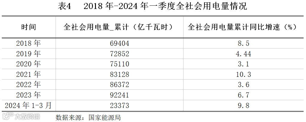 2024年1~3月,全社会用电量累计23373亿千瓦时,同比增长9.8%,增速与上年四季度基本持平。其中规模以上工业发电量为22372亿千瓦时。