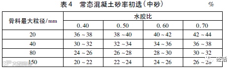 我国用砂率(砂与粗细骨料的重量比)这一概念来表征砂石用量之间的关系。在配合比设计中,先求出单位体积混凝土中骨料的总重量,再用砂率求出砂、石各自的用量。砂率的取值如表4所示。