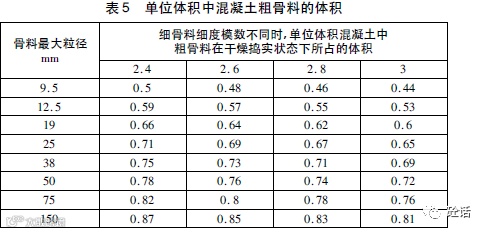 ACI的混凝土配比设计方法中并未提出砂率这一概念。其基本思路是通过规定单位体积混凝土中粗骨料所占的体积(用捣实容重表征)确定粗骨料的用量(见表5),然后用质量法或绝对体积法求出砂的用量(其中粗骨料的体积通过表中的捣实体积和捣实容重及其密度求得)。