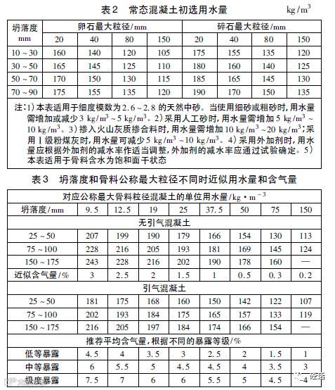 1)根据混凝土的暴露等级决定其是否需要引气,再分别针对引气混凝土和无引气混凝土,根据施工要求的工作度和骨料最大粒径初选用水量和含气量;