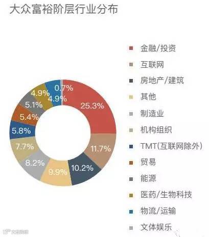 报告显现,80后在大众富裕阶层中占比47.6%,而90后也达到了13.5%的比例。互联网、金融与房地产成为造就大众富裕阶层人群的前三大行业,总占比接近一半。值得一提的是,互联网创富能力逐渐显现,许多创业者以及在互联网公司中位居要职的从业人员弯道超车,成为大众富裕阶层中的一员。