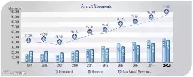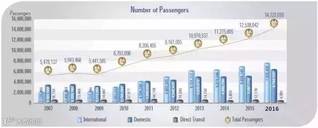 2016年,普吉国际机场客流量为14,722,010人次,其中国际乘客人数达到7,936,456人次、国内乘客人数达6,785,554人次,2016年普吉国际机场的游客人数大幅增加,“游客数量”必然带动“收入数量”。