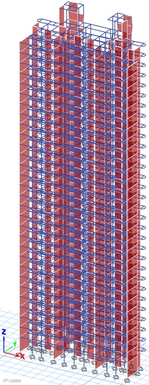 西昌市某钢结构项目由多幢住宅单体和酒店组成,总建筑面积42.47万m2,选取其中典型的2号楼作为研究对象。2号楼为高层住宅,共32层,结构高度为101.73m,长35.8m,宽15.5m,采用钢框架-钢板剪力墙结构体系,结构示意图如图1所示。设防地震分组为第三组,设防烈度为9度(0.4g),II类场地,特征周期为0.45s,考虑近场系数1.5,水平地震影响系数最大值为0.48。框架柱采用钢管混凝土柱,钢材牌号主要为Q355,局部受力较大位置采用Q390,上部楼层的管内混凝土为C45,下部楼层为C50。钢梁采用H型钢梁,钢板剪力墙为加劲钢板剪力墙形式,厚度6mm~10mm。
