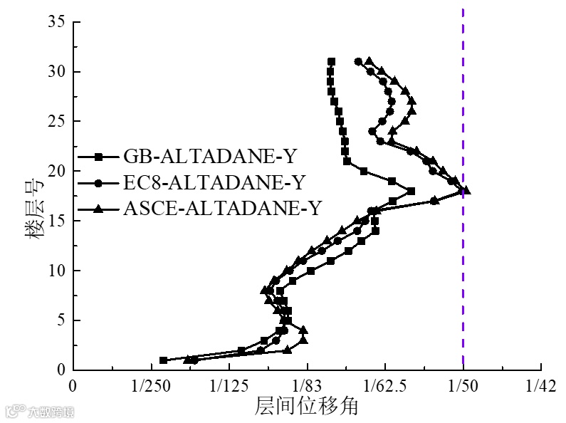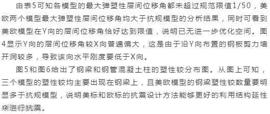 (2) 对各模型进行罕遇地震作用下的动力弹塑性分析,优化后的美标和欧标模型对应的塑性铰出现时间早,并且在最终时刻的塑性铰分布区域相比抗规模型也要更广,同时美欧模型均能满足抗规的“大震不倒”要求,说明美标和欧标的抗震设计方法能够更好的利用结构延性来进行抗震。