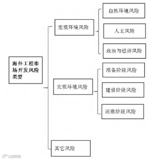 第三,其他风险。即指由第三方引发的风险,如第三方服务提供者所提供的服务不达标导致市场开发和后期工作中出现重大失误,足以影响市场利用效果,常见为第三方提供的检测、监测、分析和决策辅助风险,第三方转承包、分包执行不理想等,海外工程市场开发风险类型如图1所示。