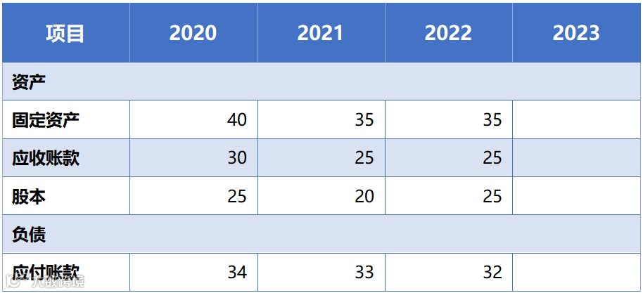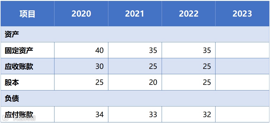 以下为甲公司2020-2023年资产负债表财务数据(应付账款发生变化,其余与示例1一致):