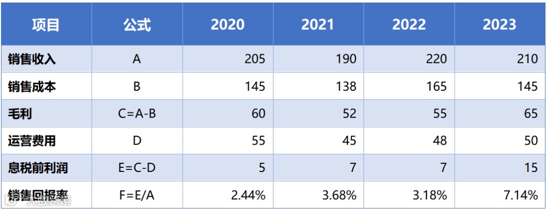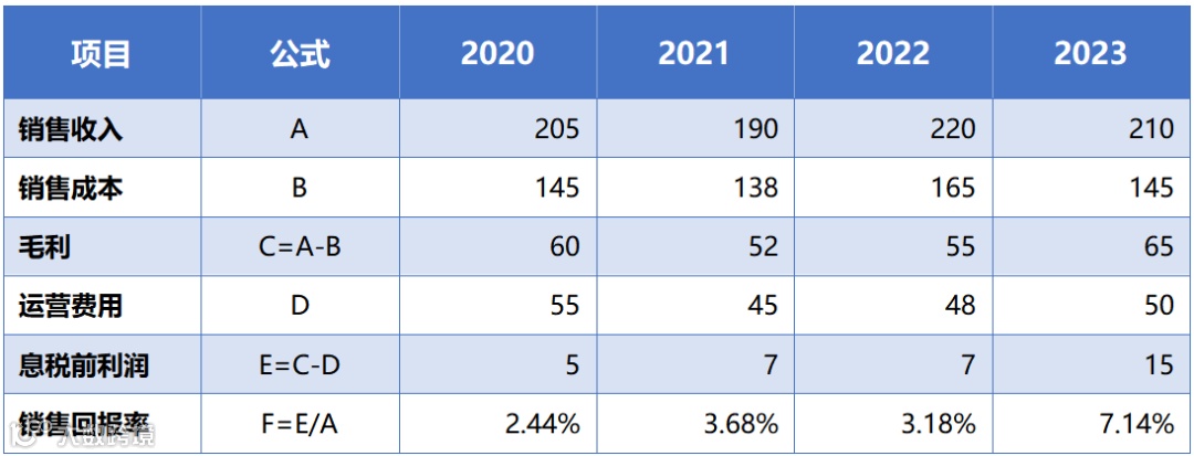 以下为甲公司2020-2023年损益表财务数据(销售成本、运营费用发生变化,其余与示例1一致):