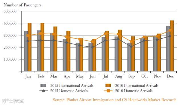 2016年普吉岛总体客流人次为7,549,346人次,其中国内到达占46%,国际到达占54%。其中1,2,3,4,7,8,11,12月旅客数量均过30万。