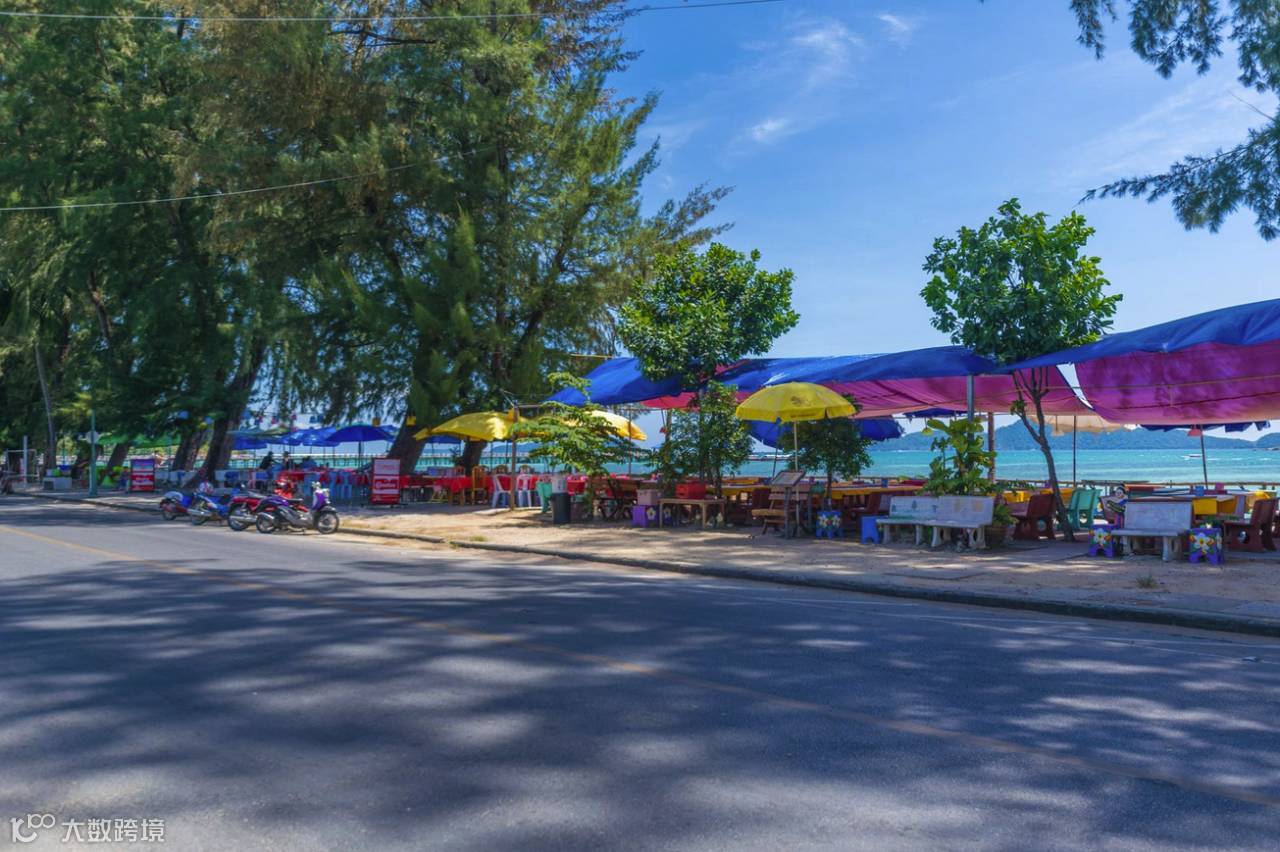 海滩边一个接着一个的海鲜大排档,