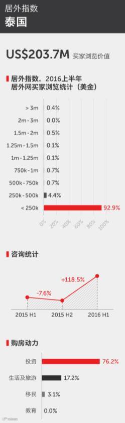 根据居外网的2016业绩显示,泰国是东南亚地区最受中国房产买家青睐的国家,也是居外网上第五最多人询价的投资目的地。