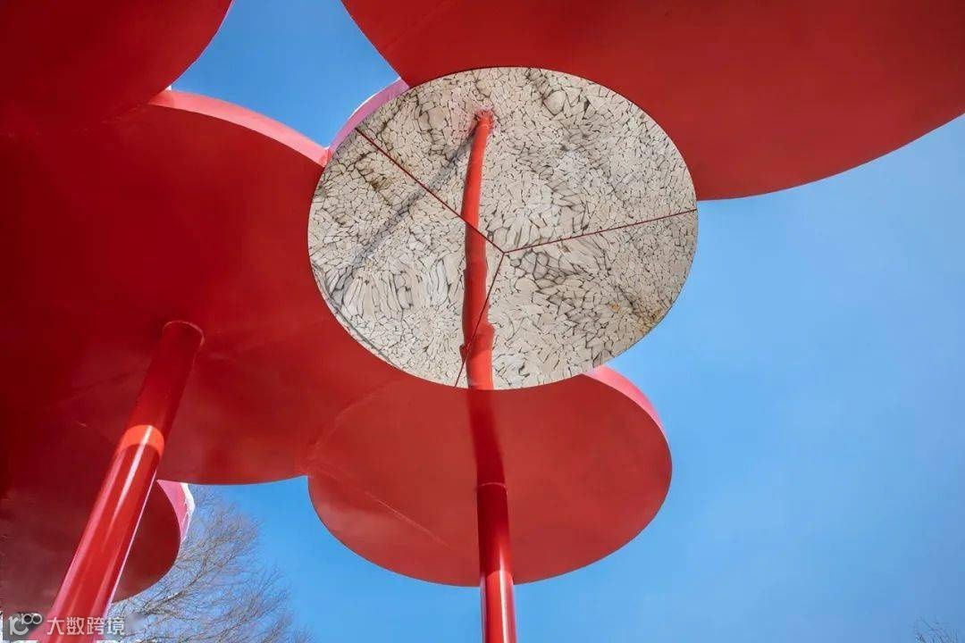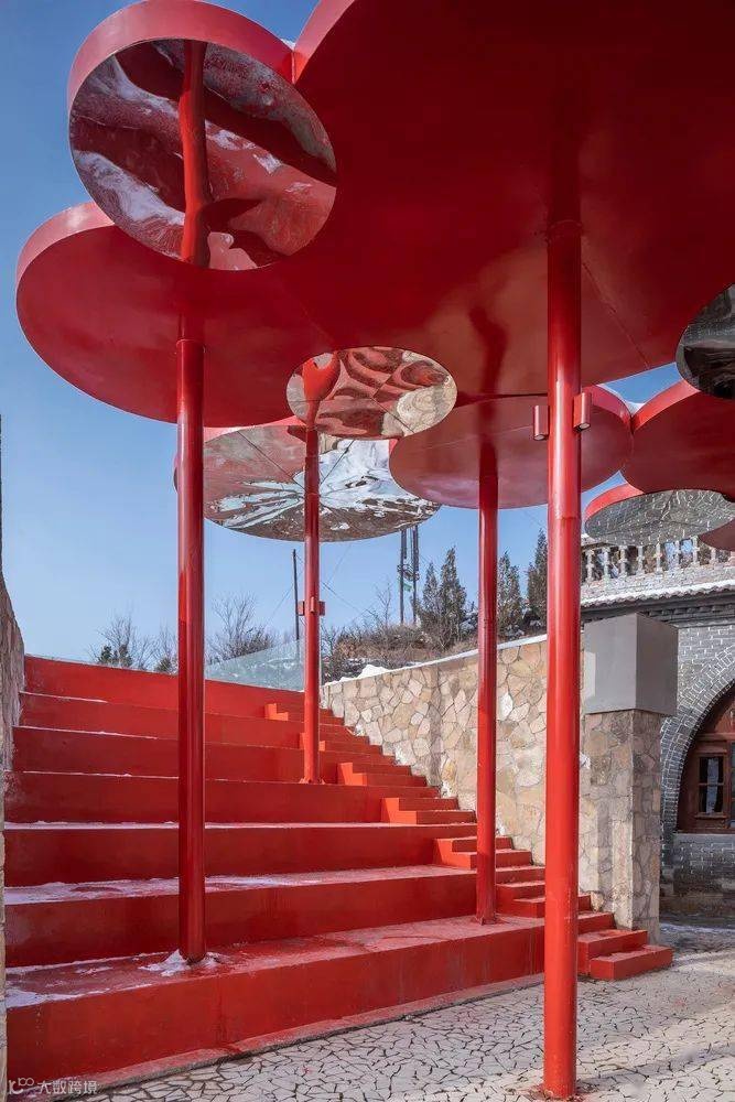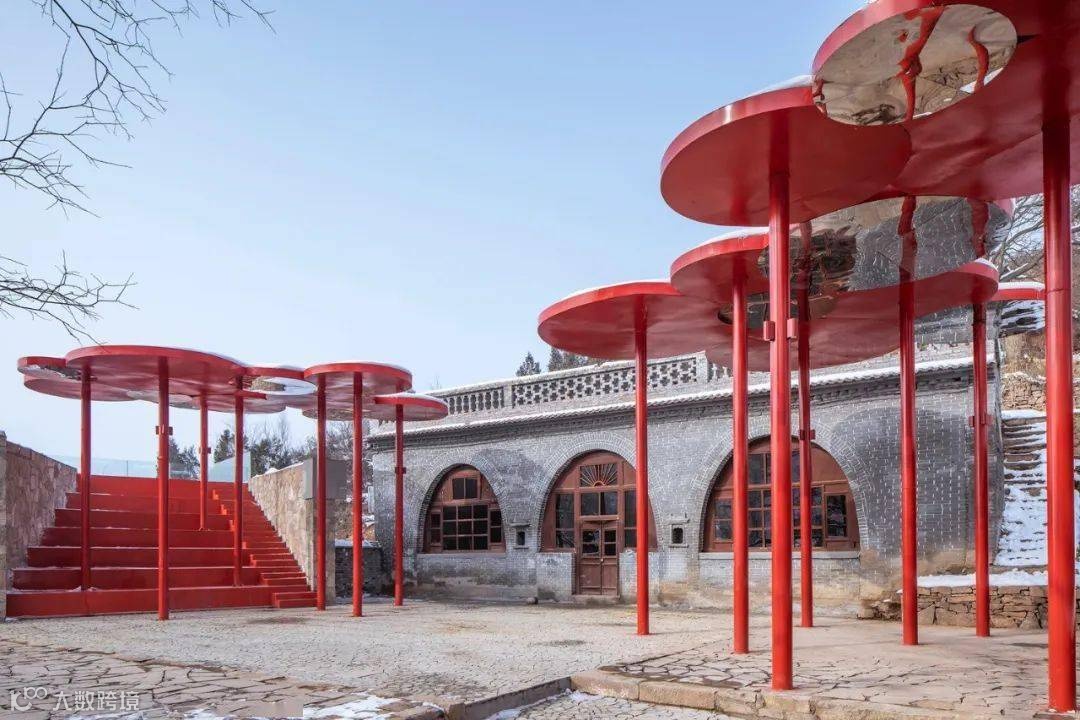 设计师将场所的新功能设置为乡村纪念堂和小型剧院,并设计了一组红色的伞状结构。