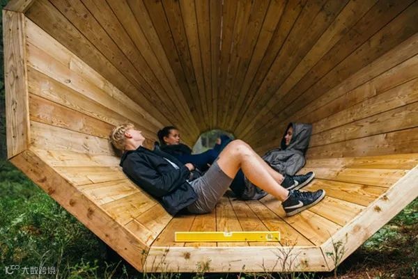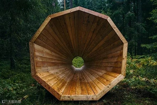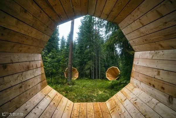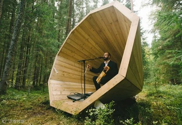 在爱沙尼亚的沃鲁县,一片森林空地被重新利用为沉思、放松以及适合社交活动的空间,通过设置了三个巨型的木质扬声器,原本稍微安静的声音,比如鸟儿的啁啾声、或树叶沙沙响都会被放大,更清晰的呈现给附近的拜访者。