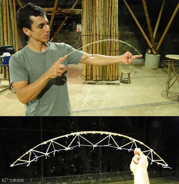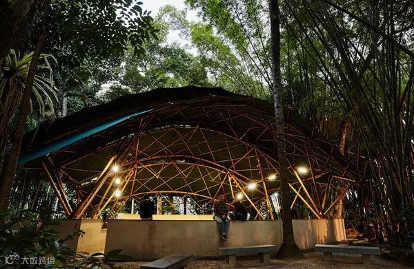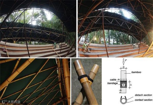 在巴西里约热内卢一所天主教大学校园内,有一个圆形可自由移动屋顶的多功能舞台建筑。它的跨度为17X12米,总覆盖面积为200平方米,设计师以竹为原料,通过使用物理模型和计算机模型进行交互,在屋顶采用弯曲和紧缩效果较好栅格网格混合竹结构,既能承受外部较大的重力,又能以两个竖立的脚架实现支撑功能。