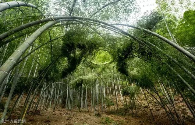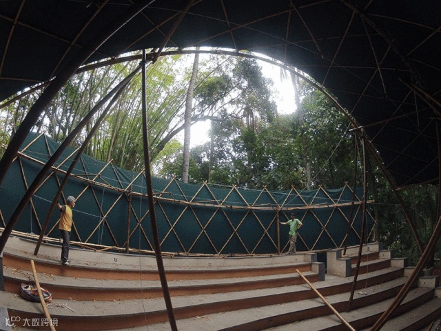 毛竹韧性极强,且下弯一定程度依然保持良好的生长状态。于是在较平坦的空地上,将四周毛竹井然有序地拉下,围合出一个穹顶,便形成了一个天然的竹林剧场。