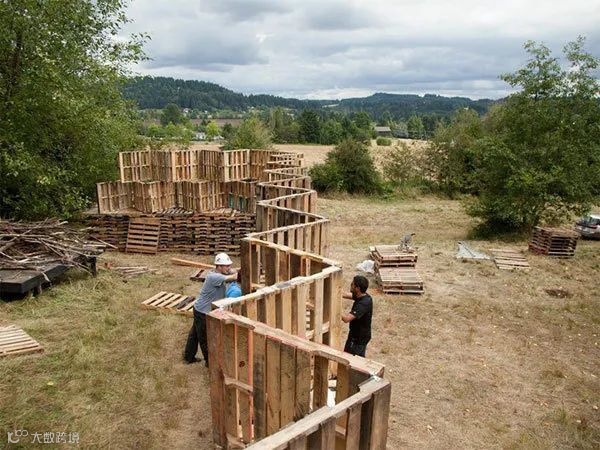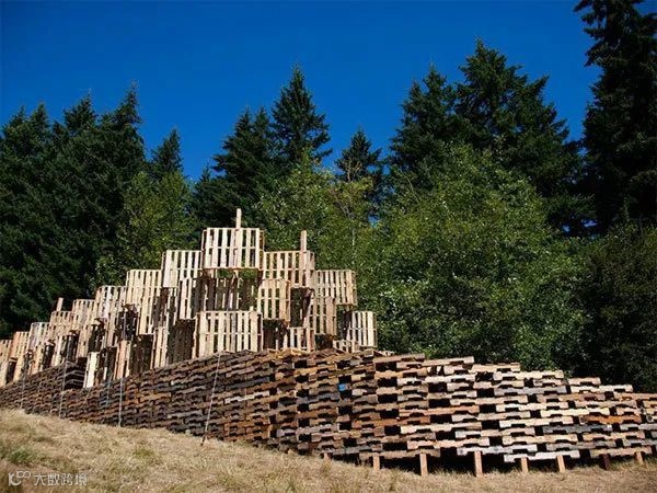舞台是由520个木制回收运输托盘和6000个螺丝钉搭建而成的,高度在40英尺 x 60英尺(约12.2米 x 18.3米)左右,以蛇形弯曲形状展开。