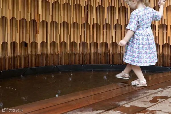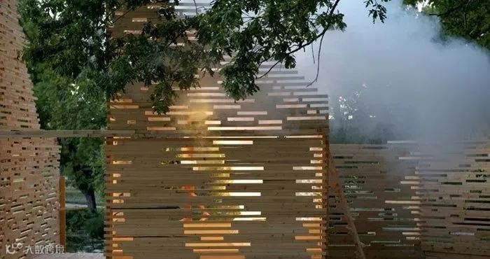 舞台外形呈半椭圆的穹顶结构,建材选择具有较高耐水性且颜色深浅不同的雪松;内部复杂、精密,通过隐藏的相互连接的水管、人造花洒,形成滴答滴答循环落水的效果。