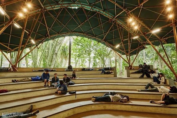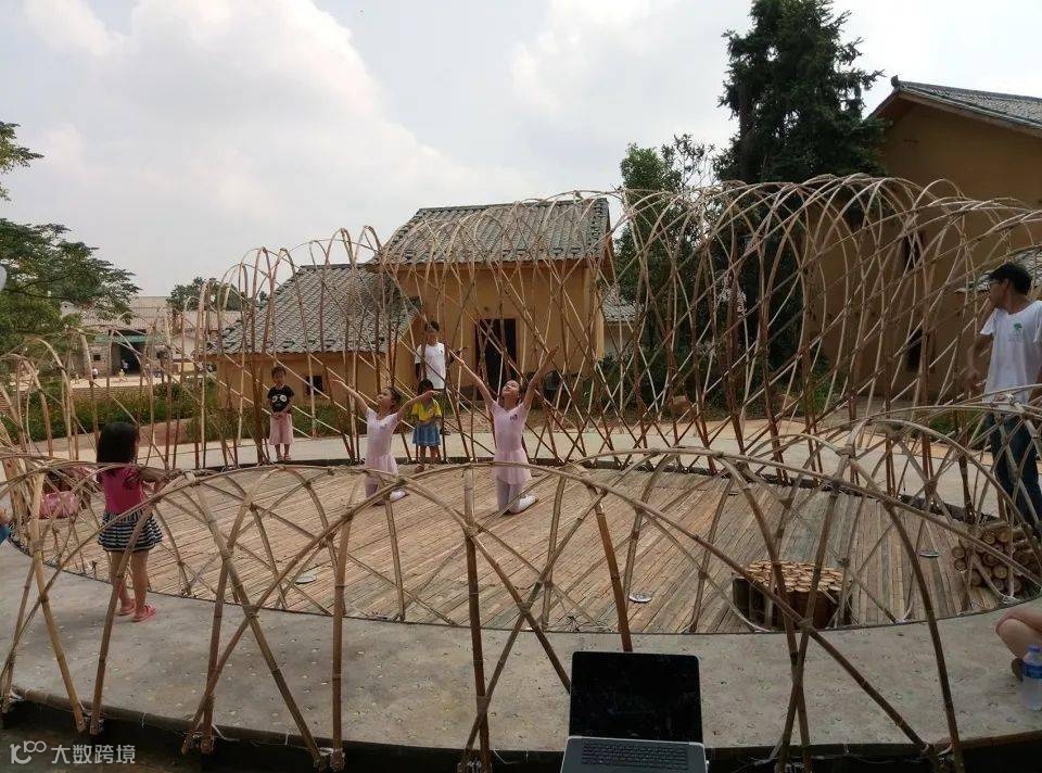 用当地的竹子建造,结合声光控制系统,提供交互式体验;配备太阳能落地灯和喷雾冷却装置,改善微气候的同时打造舞台效果。