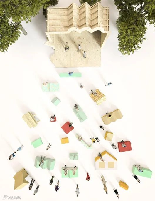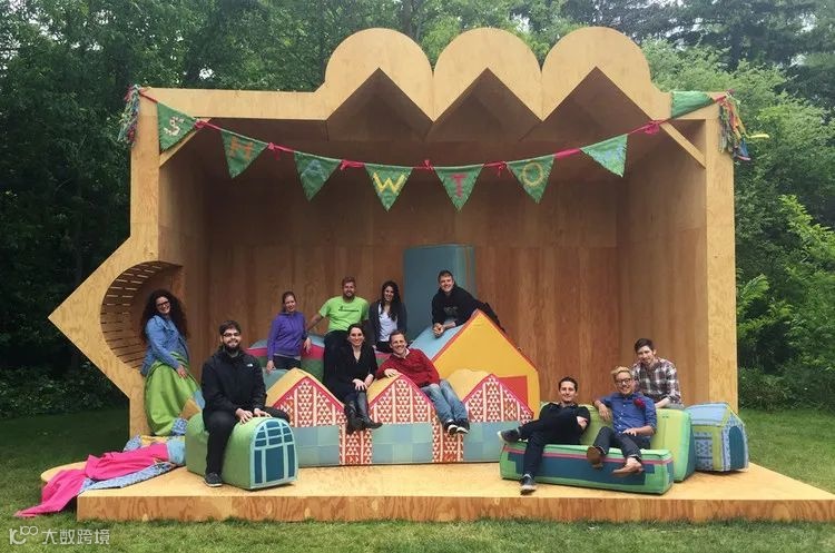 该项目由二十个靠垫和一个木盒子组成,这一设计起到了双重目的,既容纳了这些靠垫,又用作户外表演的舞台。项目起名为Shaw Town,形式简单但融入了丰富含义。