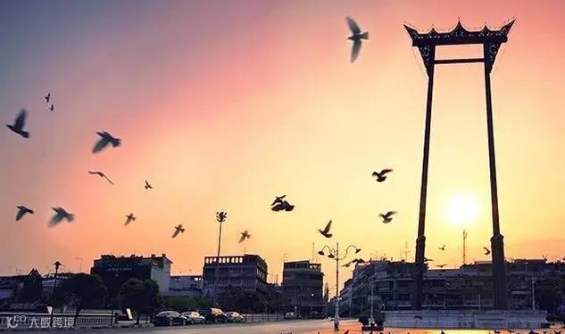 大秋千座落在曼谷市政府及善见寺(Wat Suthat) 前,是曼谷著名地标,露天下的大秋千在烈日高照的白天没有特别显眼,当太阳缓缓下山之际,鸟儿低空盘旋,周边的灯光渐渐亮起,灯光投射在古色古香、复古的房子,即呈现另一种独特的夜之美,是许多摄影爱好者喜欢捕捉的画面之一。太阳西下,红彤彤的太阳落在大秋千两根柱子之间,堪称最美。