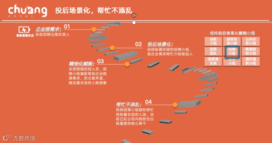 后来我们仔细分析了公司的需求情况,更主要是抓住了主要矛盾。如果是选择出海的相关对接人,技术方面其实是不需要有更强的语言能力的,因为技术人员可以从国内外派,反而对候选人对所在地的法律,法规,工会等更熟悉,而语言能力反而是其次的(欧美国家其实英语是通用的)。因此我们对公司的候选人标准做了修改,不再限制在一个小的行业范围(不要求懂这方面的技术),而是对候选人在当地或者整个经济圈当中,有并购整合的经验,甚至是有企业运维经验,懂当地的法律法规等事务。最终推荐的候选人一次性就通过了公司的重重面试,目前已经在公司内部担任比较重要的核心骨干。这是我们在帮助被投企业的招聘方面做出的一个小小的贡献。