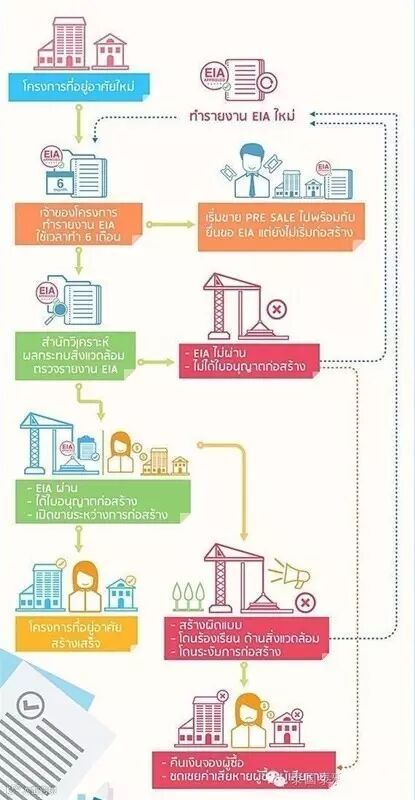 非常重要!因为泰国法律的规定!如果地产项目不能通过EIA,那么开发商就拿不到建筑许可证;或者如果项目提前开建,最终没能通过EIA的审核,那么项目也会被立即叫停。一般开发商会在项目开工前把所有文件递交“环境影响分析部”(泰文:สำนักวิเคราะห์ผลกระทบสิ่งแวดล้อม (สวผ.)),也就是审核EIA的部门,大约需要6个月的审核时间。假若没能通过,那么就修改方案继续提交直至审核通过为止。