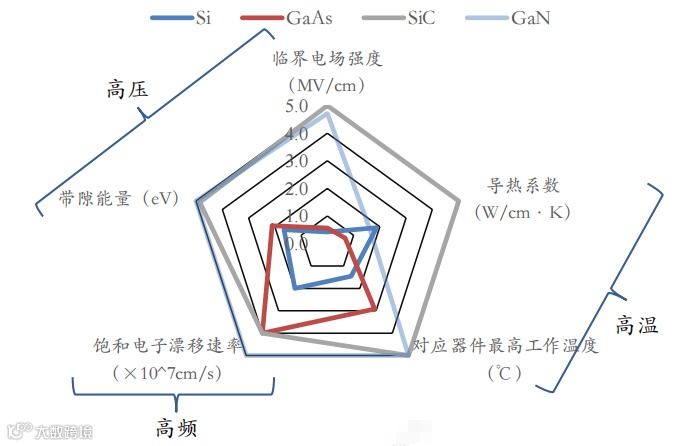 射频领域,主要是以SiC为衬底的GaN射频器件,具备SiC高导热性能和GaN高频段下大功率射频输出优势。