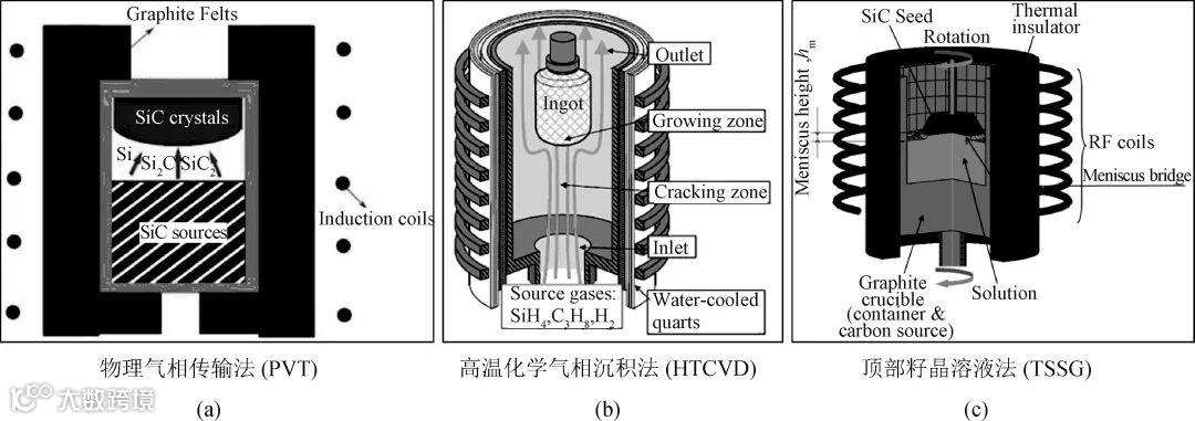 顶部籽晶溶液生长法(TSSG)是高温溶液生长法(HTSG)中最主流的应用模式,属于液相法的一种。TSSG法用高纯石墨制成的坩埚作为容器和碳源,利用感应线圈加热,使用熔融的硅和助溶剂(铬等金属),碳原子在坩埚的高温区域溶解,并随着热对流传输到顶部籽晶处的低温区并在籽晶上结晶。由于TSSG法需要的温度比PVT低,因此这种方法也适用于制备3C-SiC。TSSG法生长成本低,缺陷密度低,向高温溶液中添加一定量的Al便可以对晶体进行持续稳定的p型掺杂。相比之下,PVT法的温度较高,Al的饱和蒸汽压较大,容易导致Al耗尽速度快,掺杂不均匀,且带来较大的缺陷密度。缺点在于,金属杂质难以控制,且生长晶体尺寸小,目前商业化进度不高。