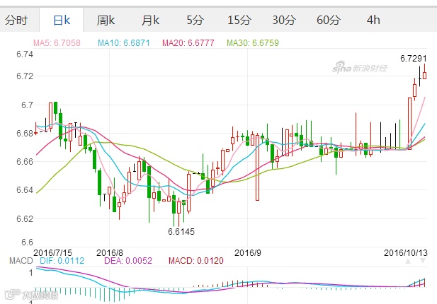 “十一”期间,因美元指数大涨,离岸市场人民币报价一度逼近6.72,似乎已为在岸市场的暴跌做好了铺垫。继10月6日,离岸人民币汇率跌破6.7关口后,10月7日,离岸人民币汇率跟随“闪崩”的英镑在早盘一度跌至6.7182,创下9个月以来新低。分析称,离岸人民币在“十一”期间大幅波动,原因在于市场对美联储加息预期上升,9月外储创5年新低以及英镑“闪崩”导致避险情绪升温等。离岸人民币9月外储刷新五年低位,人民币贬值压力加大。中国9月末外汇储备环比减少188亿美元,降至31663.8亿美元,跌幅超预期,为连续三个月下降,创下了2011年5月以来最低水平。
