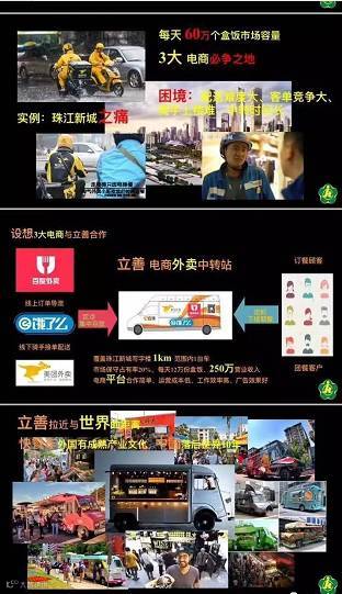 吴总表示:立善的目标是成为下一个滴滴、摩拜!,并设想与三大美食电商平台(百度外卖、饿了吗、美团外卖)合作,先是在平台进行线上订单-再到立善电商外卖平台中转站-订餐客户下楼取餐!