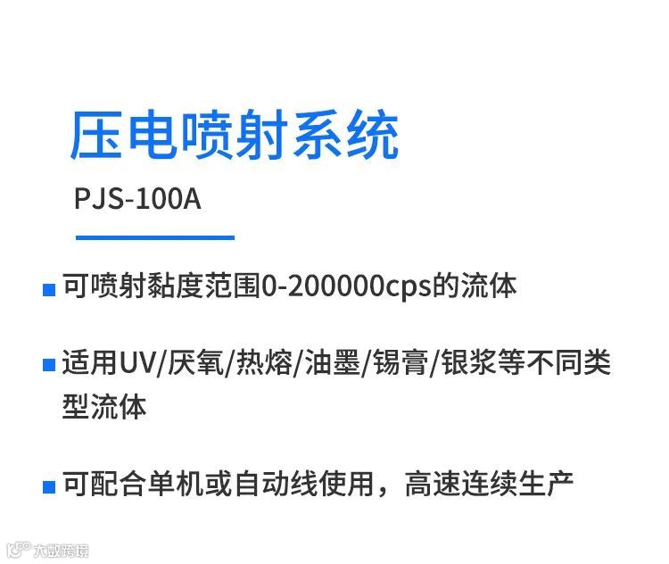 PJS-100A压电喷射系统具有业界先进的微量喷射式点胶技术和稳定性,同时适用UV/厌氧/热熔/油墨/锡膏/银浆等多种类型的流体喷射,实现高速连续生产,大幅度降低客户使用成本。