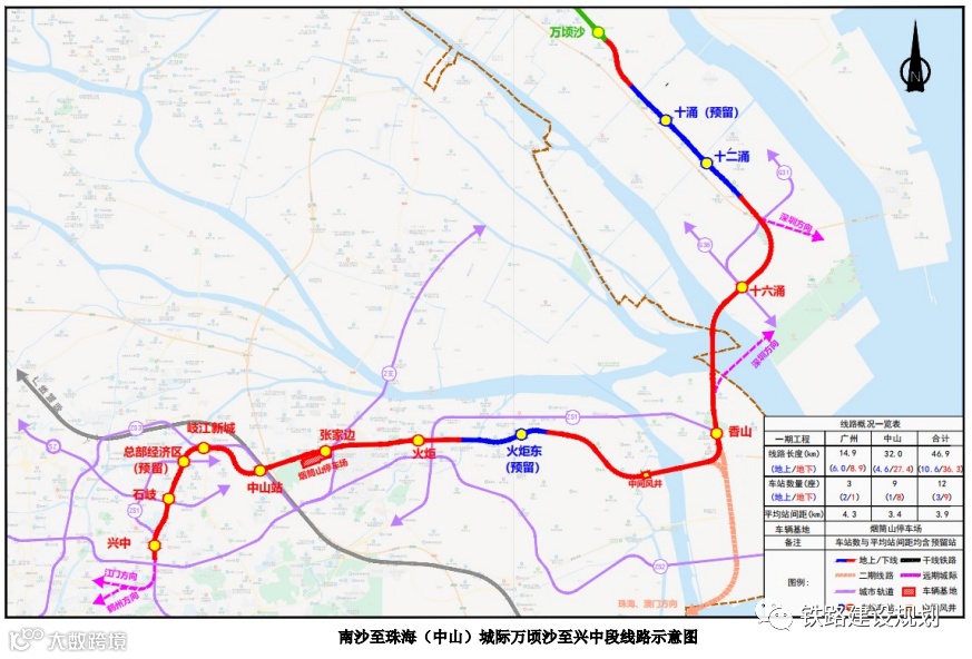 (一)主要建设内容。线路起于广州市南沙区万顷沙站,止于中山市兴中站。新建线路正线长度47.6公里,其中桥梁4.6公里、路基0.15公里、隧道42.85公里。线路设计时速160公里。全线设万顷沙(既有)、十二涌、二十涌、香山、火炬、张家边、中山、岐江新城、石岐、兴中等10座车站,预留火炬东站。新建烟筒山停车场1座,新建烟筒山、香山主变电站。线路预留自香山站向珠海方向延伸条件。