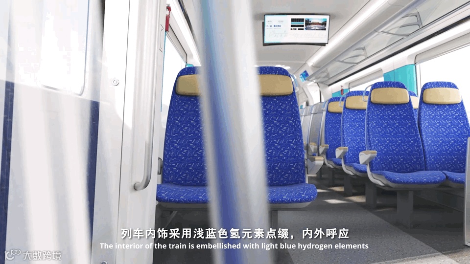 列车内饰采用浅蓝色氢元素点缀,内外呼应,尽显列车绿色低碳特征。整车以深蓝为主色,浅蓝和黑色为点缀,外观设计科技前卫、颜值满满。