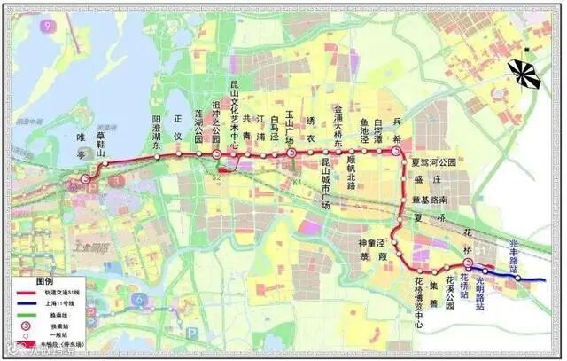苏州轨交11号线长41.27公里,设站28座,起于苏州工业园区唯亭站,向东止于位于昆山的花桥站,上海地铁11号线在花桥站相接实现换乘。该线为苏州首条市域轨交线路,也是连接市区、昆山和上海市的交通走廊,通车后市民可在市区乘坐地铁向东,经数次换乘到达上海市区。