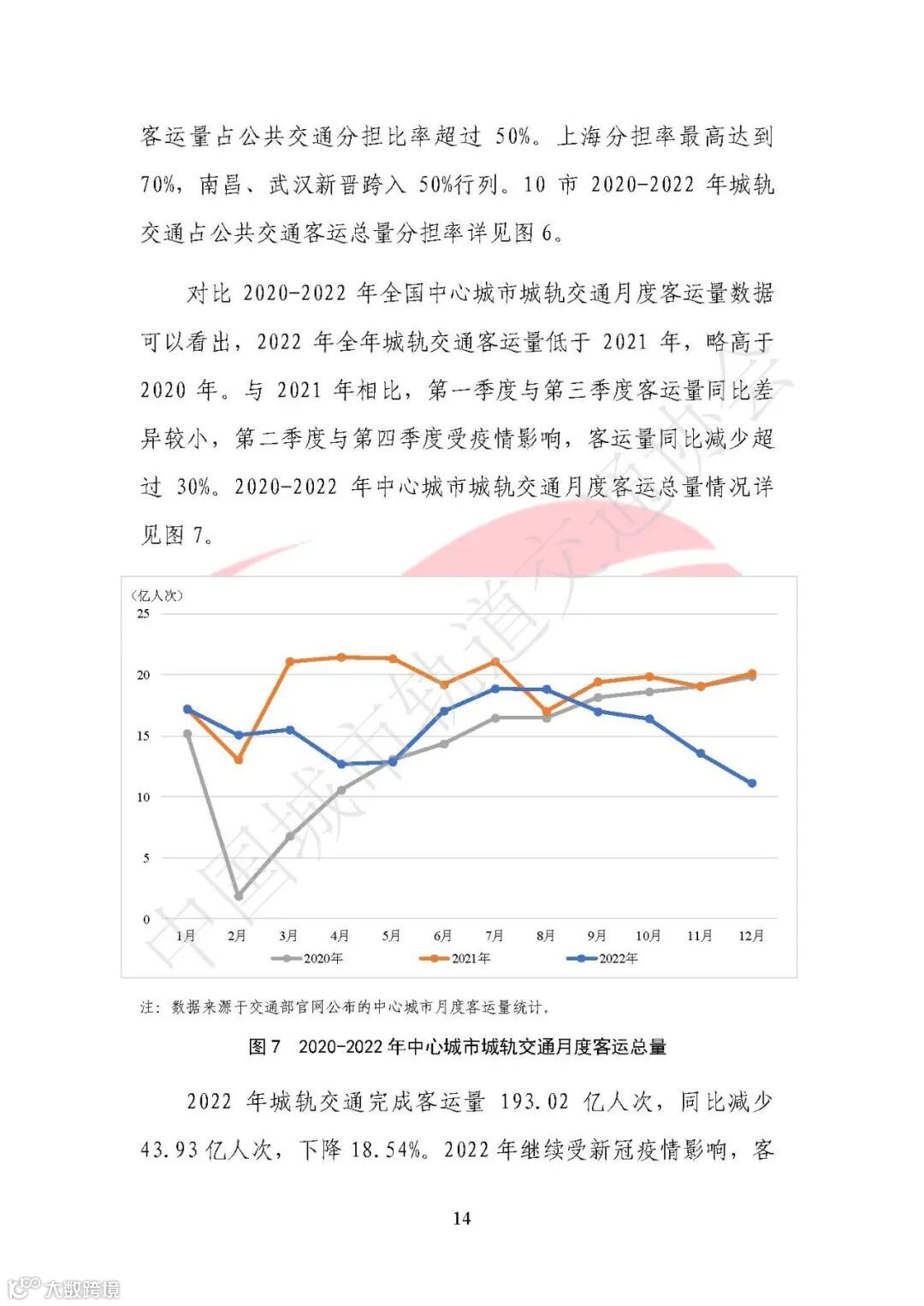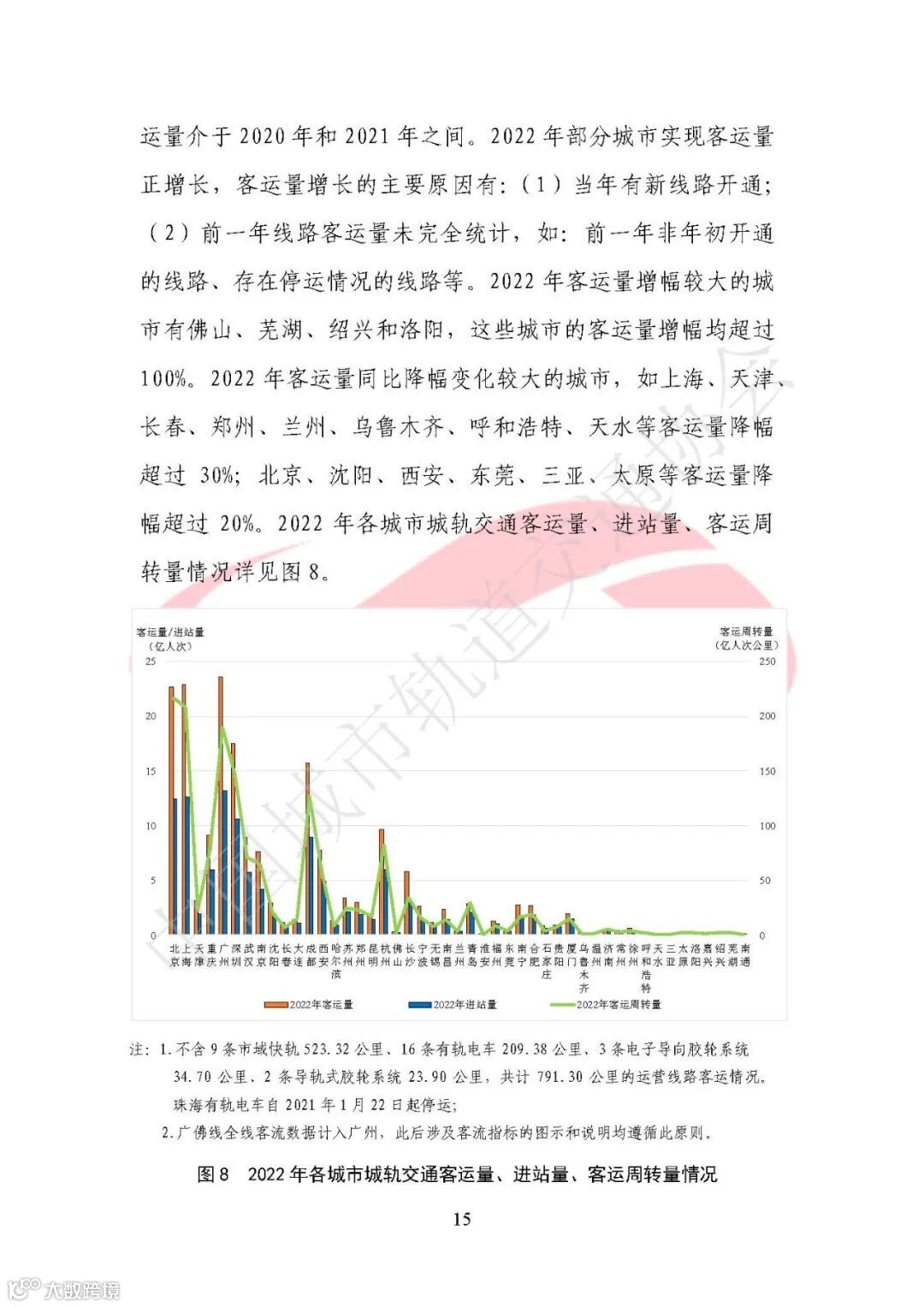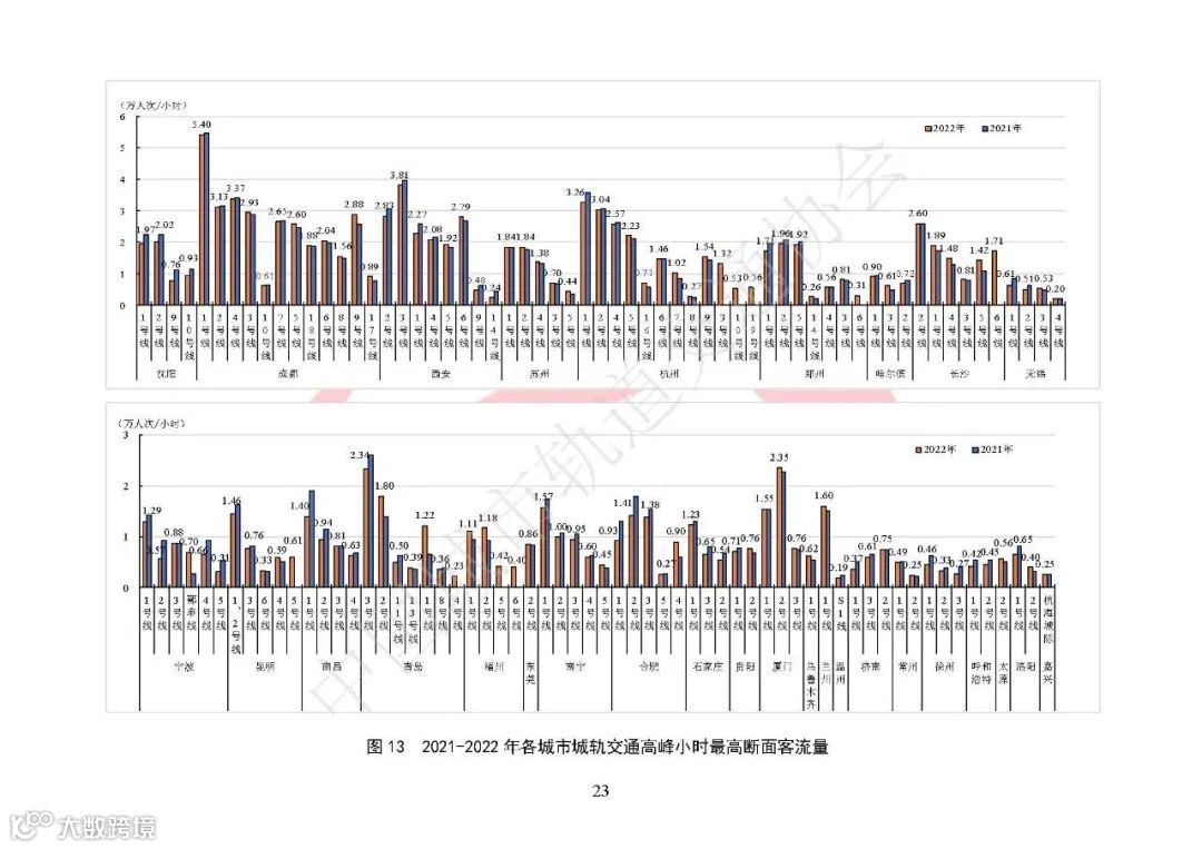拥有4条及以上运营线路,且换乘站3座及以上的城市26个,占已开通城轨交通运营城市总数的47.27%。2022年全年累计完成客运量193.02亿人次,同比下降18.54%;总进站量为116.56亿人次,同比下降20.35%;总客运周转量为1584.37亿人次公里,同比下降20.05%;与上年同期相比全年客运水平整体下降。