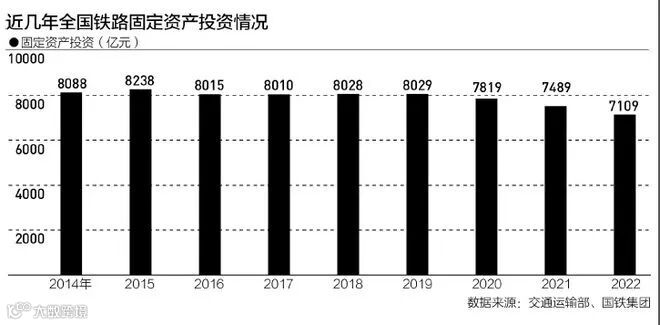 最近几年,铁路投资呈现逐年下降的趋势。全国铁路固定资产投资总额在2020年以前多年保持在8000亿元以上的规模,但从2020年开始下降,2022年为7109亿元,下降5.1%,比2021年跌幅扩大0.9个百分点。