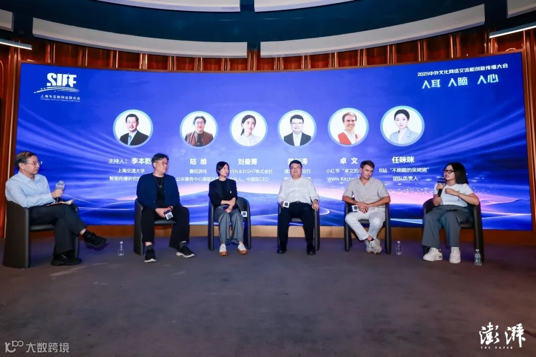 大会的圆桌环节,由上海交通大学智能传播研究院院长李本乾担任嘉宾主持,叠纸游戏公共事务中心高级总监陆维,EVEN&EIGHT HOLDINGS株式会社合伙人、中国区CEO刘曼菁,浦发银行总行跨境部总经理龚剑涛,小红书“卓文的小食堂Wens Kitchen”博主卓文,B站“不刷题的吴姥姥”团队负责人任咪咪共同围绕中国文化出海、传播创新等议题展开交流和讨论。