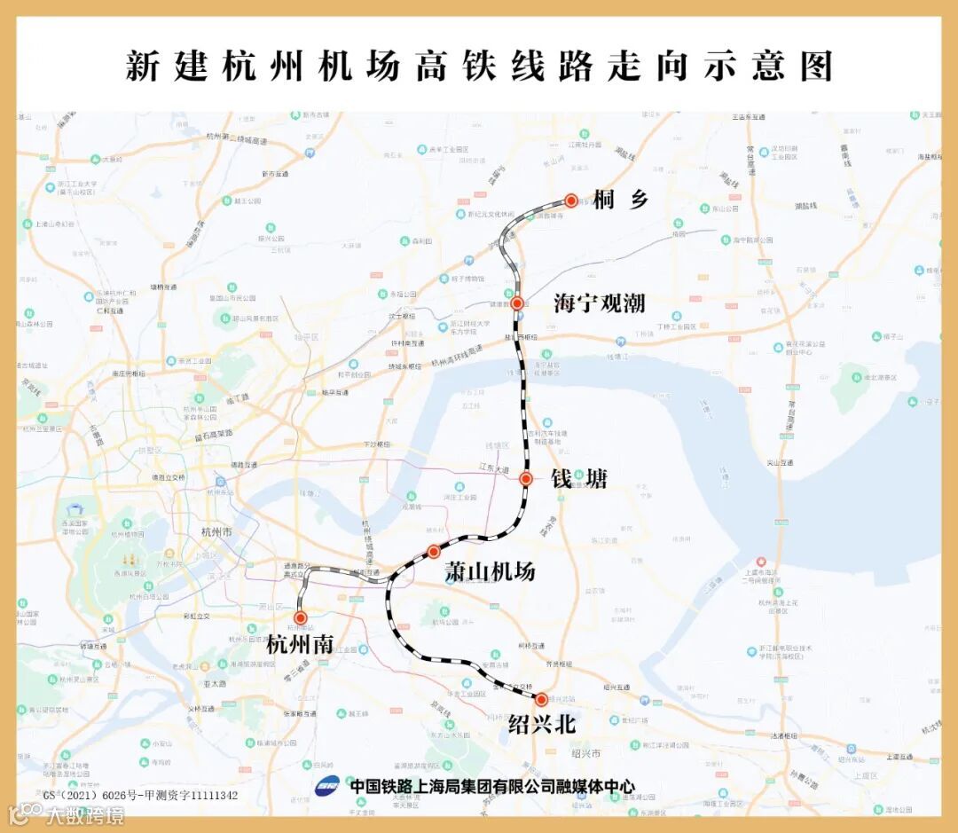 柯桥区,终至绍兴北站,全线设海宁观潮、钱塘、萧山机场、绍兴北等车站,