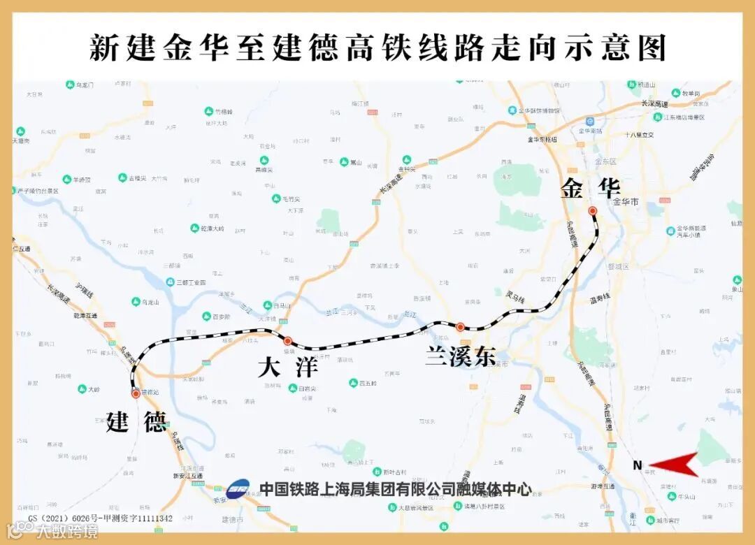 金建高铁位于浙江省西南部,线路自既有金华站引出,向北经兰溪市、建德市,在建德站接入杭黄高铁,沿线设金华、兰溪东、大洋、建德4座车站,其中兰溪东站和大洋站为新建车站。