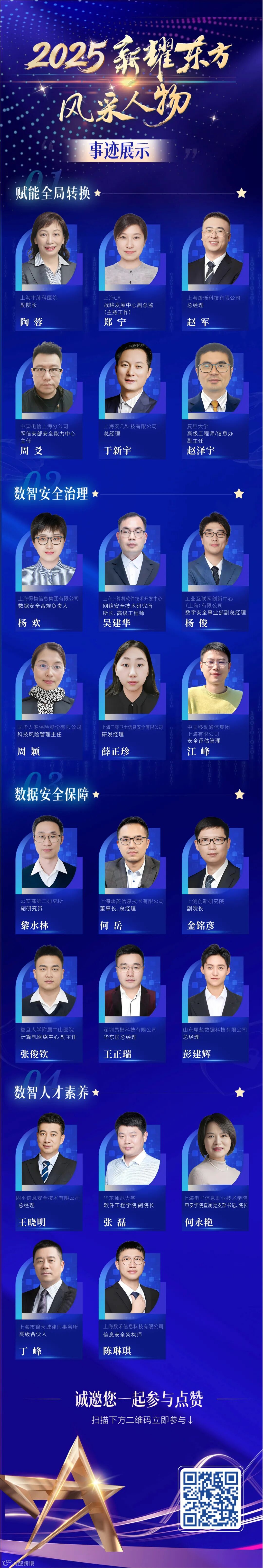 启动后反响热烈。经初审,23 位候选人凭借突出成果入围网络点赞环节,涵盖赋能全局转换、数据安全保障、数智安全治理、数智人才素养四大类别。正式进入网络点赞助力环节。他们的实践成果,深刻践行 “以新安全格局保障新发展格局” 的核心要求,为行业树立了 “技术向善、安全筑基” 的价值典范。