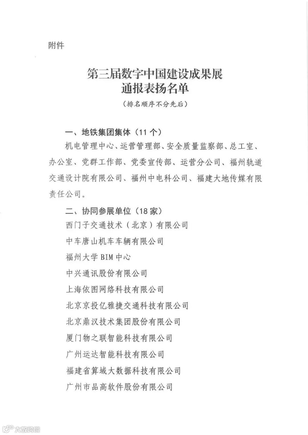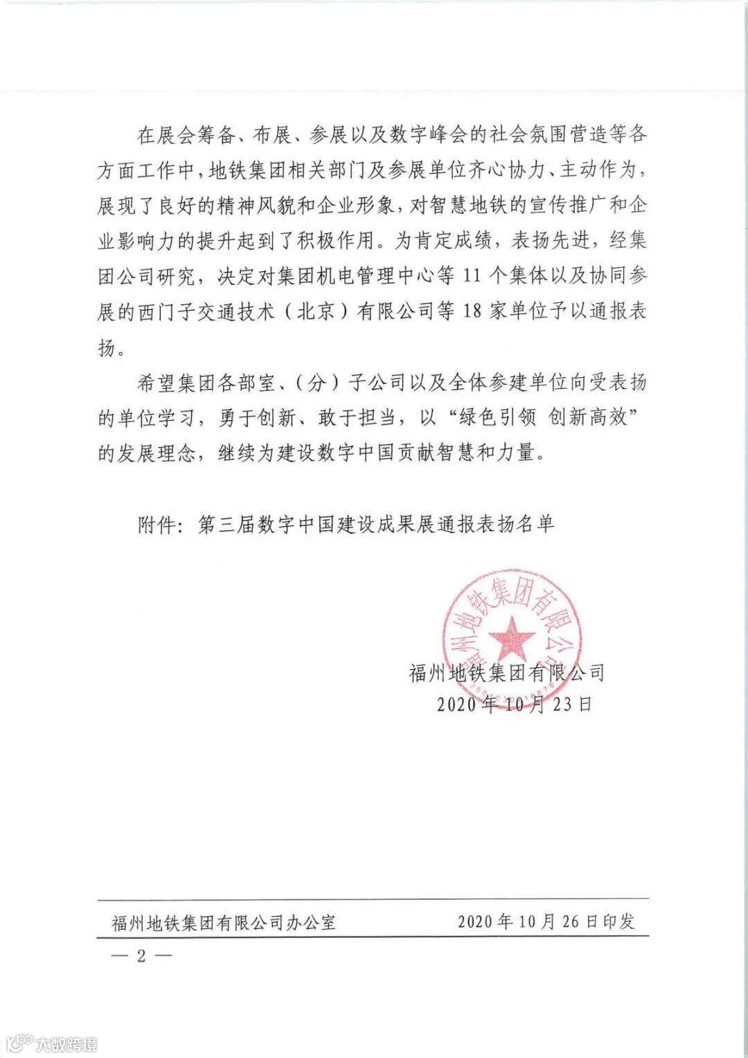 10月26日,福州地铁集团印发了《关于对第三届数字中国建设成果展工作予以表扬的通报》,集中表扬了在筹备、布展、参展以及数字峰会的社会氛围营造等工作中作出突出贡献的集团机电管理中心等11个集体以及协同参展的西门子交通技术(北京)有限公司等18家单位,劢坦信息科技(上海)有限公司(MTC)荣登榜单。