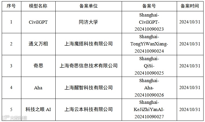 2、上海市生成式人工智能服务已备案信息公告
