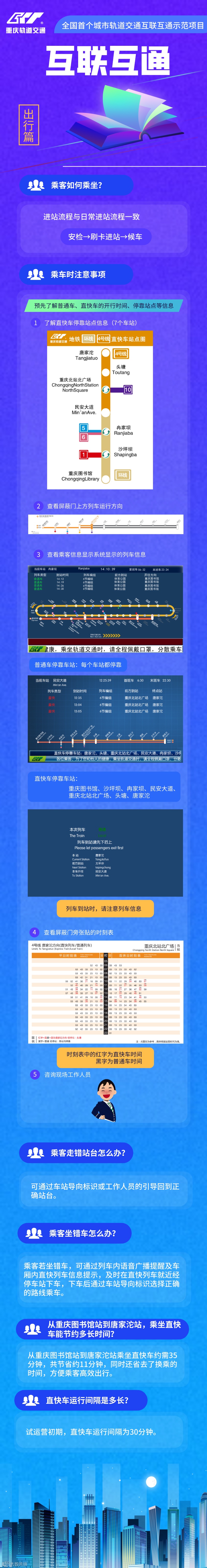 需要乘坐直快列车的乘客,可通过重庆轨道交通官方微博、微信公众号以及车站广播等方式了解列车运行时刻表等相关运营信息,科学规划出行路线,也可在站内查看导向标识或询问车站工作人员。
