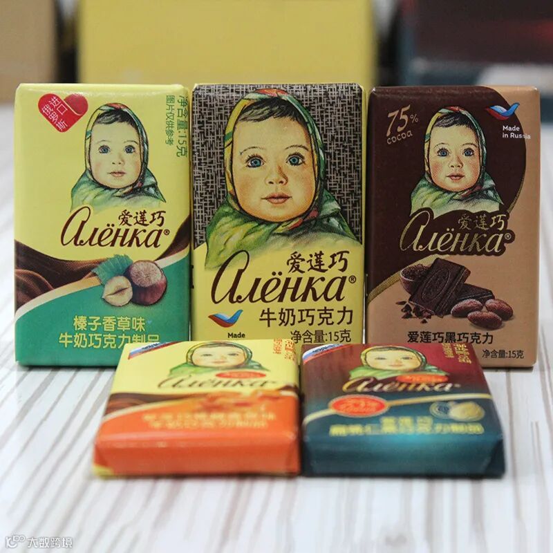 • 爱莲巧 Alionka 巧克力(俄罗斯): 那个戴头巾的“大头娃娃”是几代人的记忆。来自“红色十月”糖果厂,纯可可脂制作,还原纯正的俄式风情。