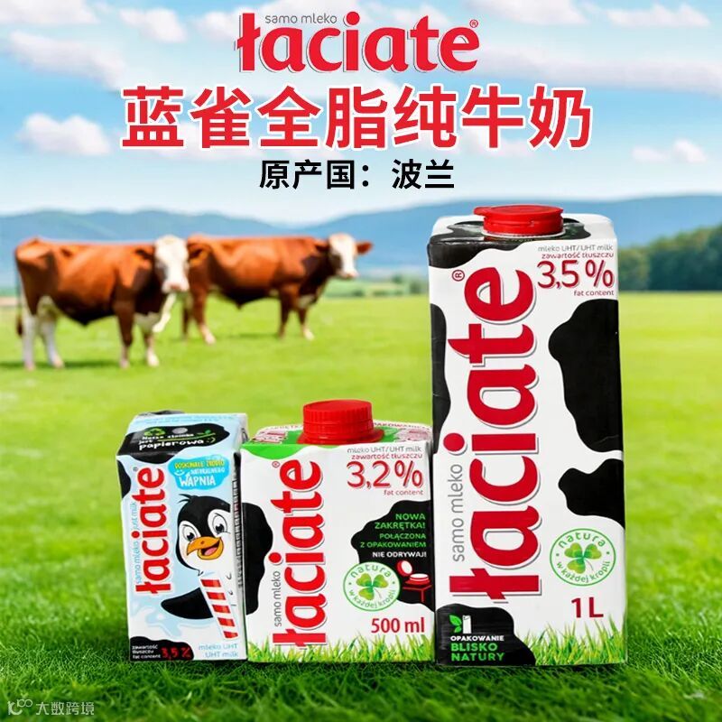 • 蓝雀 Laciate 纯牛奶(波兰):源自欧洲黄金奶源带,乳脂含量高(部分达3.5%),入口便是香醇浓郁的欧洲奶香。