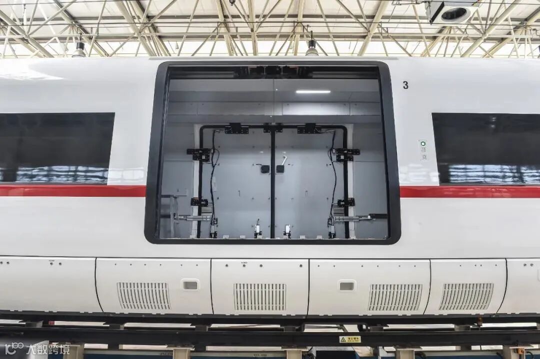 12月23日,记者在中车唐山公司看到,这列具有中华鲟骨骼仿生形车头、银白红三色贯通车身的高速货运动车组,每节车厢侧面都有一对2.9米宽、全球最大开度的装载门,这是高速货运动车组区别于普通客运动车组最显著的外观特征。