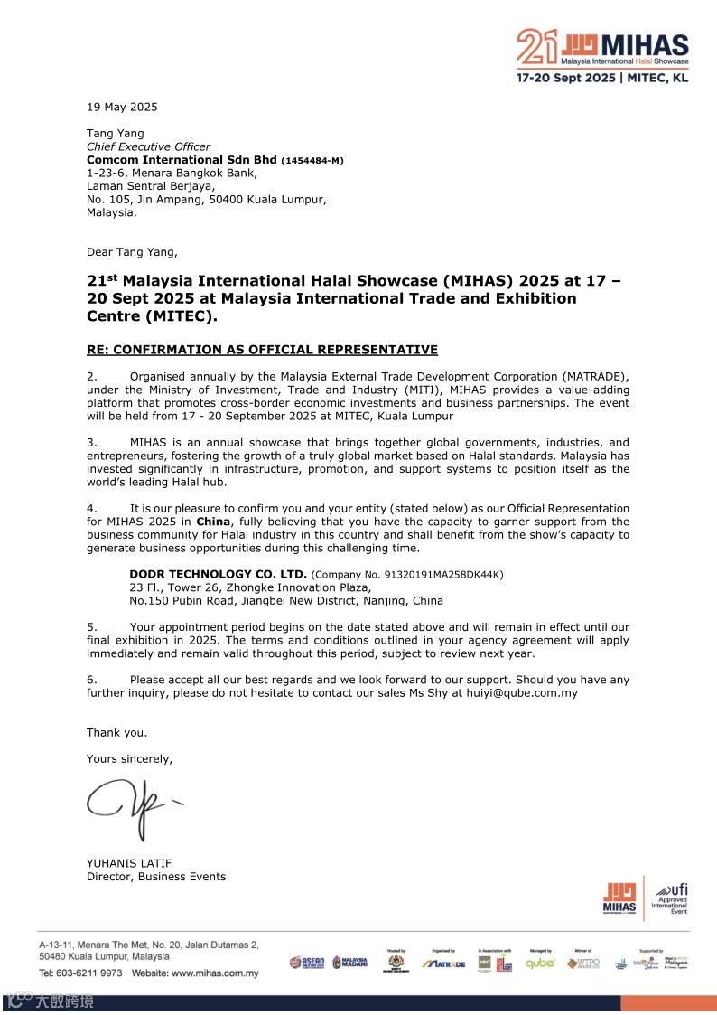 MIHAS 展中国官方代表授权函
