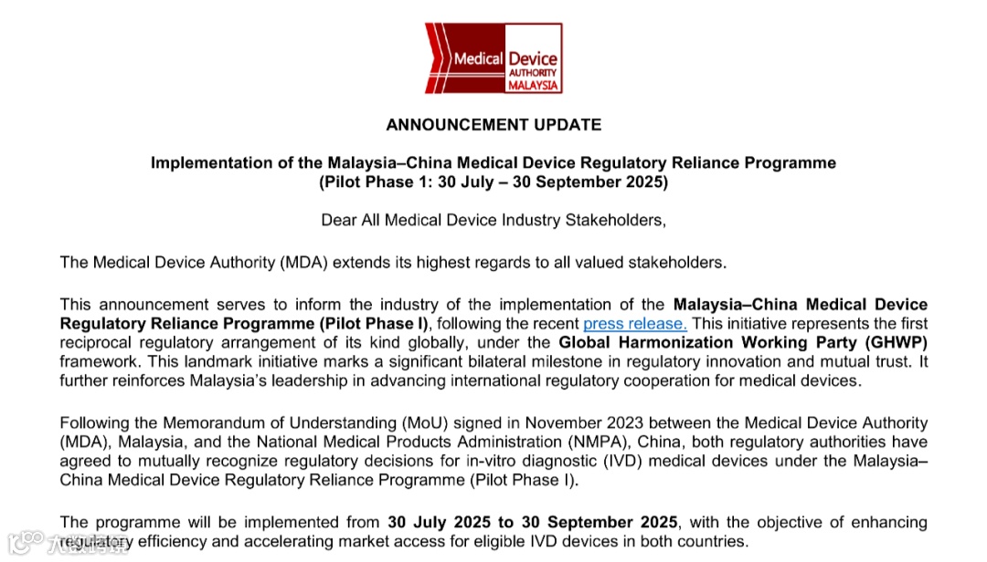 2023 年 11 月,马来西亚医疗设备管理局(MDA)与中国国家药品监督管理局(NMPA)签署了谅解备忘录,随后该计划便应运而生,使两国能够相互认可对方的上市前审批监管决定。此次马来西亚宣布启动中马两国医疗器械监管互认计划,是中马两国自2023年11月签署合作备忘录后的重大突破,标志着中国监管体系首获国际全面认可。