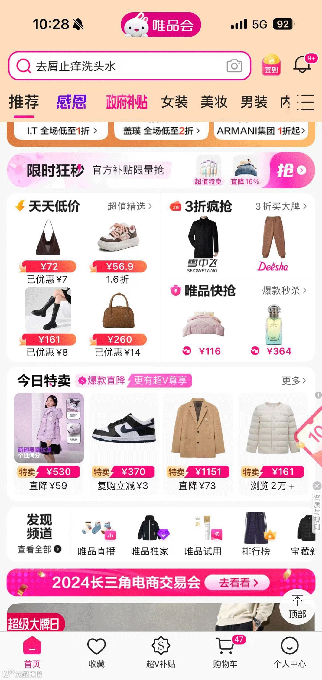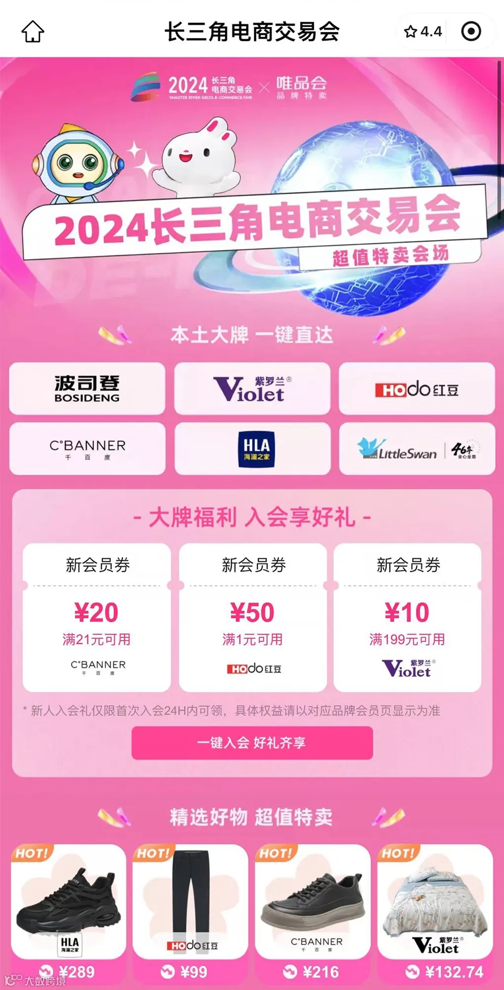 展会期间,交易会联合唯品会打造线上交易会专场活动,与线下交易会双线呼应,扩大展会规模。唯品会首页首屏设置长三角电商交易会线上主会场,江苏、浙江、安徽等长三角地区品牌强势联动,同步发放线上消费券,掀起线上购物狂欢热潮,将“促消费”行动落在实处。