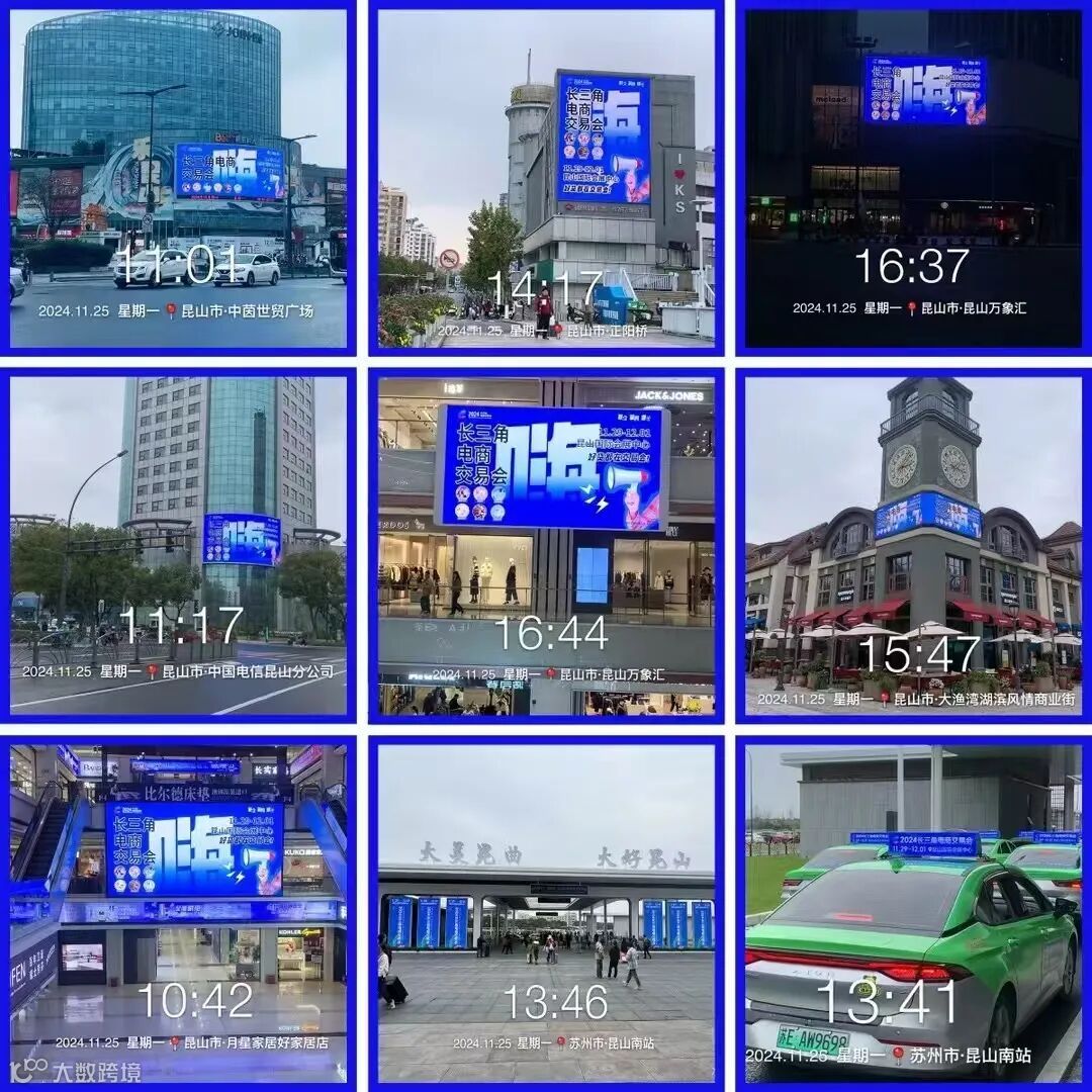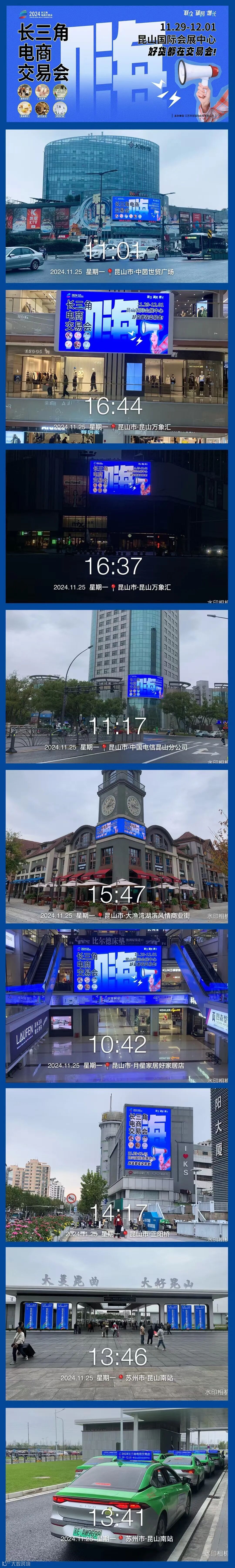 组委会持续投放抖音信息流及微信朋友圈广告,宣传曝光搭1000万次+,同时在昆山市人民路、前进路、万象汇、电信大楼、月星家居、高铁南站等地标建筑及人流旺区等近400处LED大屏投放宣传资源,全市1000余辆出租车顶灯也对交易会进行流动宣传,全方位打造家喻户晓的交易会。