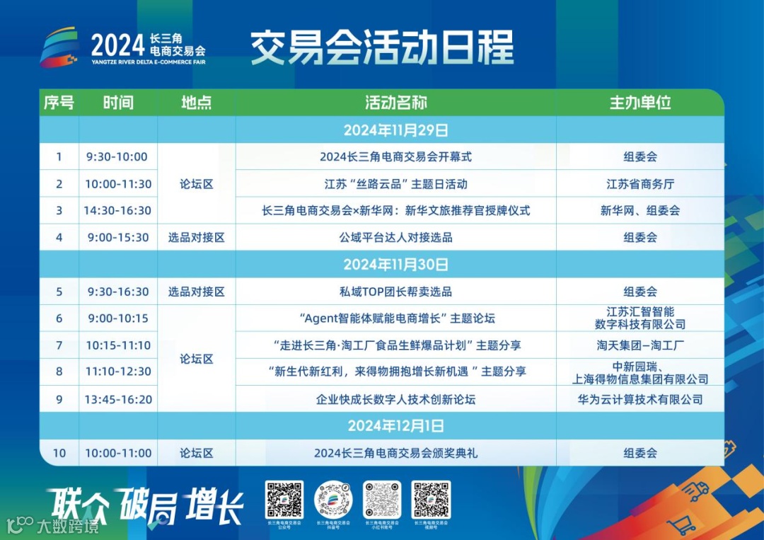 除了29日举行的2024长三角电商交易会开幕式、江苏“丝路云品”主题日活动、“文旅推荐官”授牌仪式、公域选品对接日等配套活动之外,接下来的两天,汇智智能将带来“Agent智能体赋能电商增长”主题论坛,华为云计算公司将携数字人新品带来“企业快成长数字人技术创新论坛”,淘天集团将带来“走进长三角·淘工厂食品生鲜爆品计划”主题分享;得物集团将带来“新生代新红利,来得物拥抱增长新机遇”培训分享会,组委会将带来“私域TOP团长帮买选品会”主题活动。近十场活动将为企业提供发展趋势分析、选品策略、店铺运营、案例剖析、AI赋能、Agent大模型等实操分享。